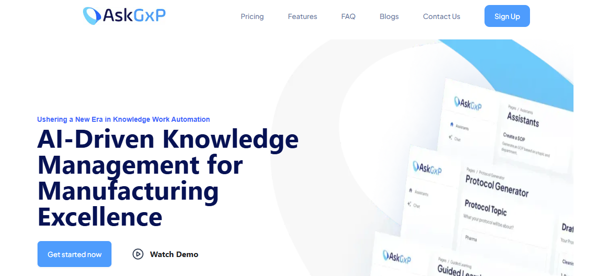 AskGxP is an AI driven knowledge and compliance assistant focused on pharmaceutical GxP needs. The platform provides AI chat for regulatory guidance, AI generated SOPs and protocol drafts, and curated updates on relevant guidelines. Knowledge is organized to support quick lookups and practical answers, reducing time spent searching through reference documents and historical files.