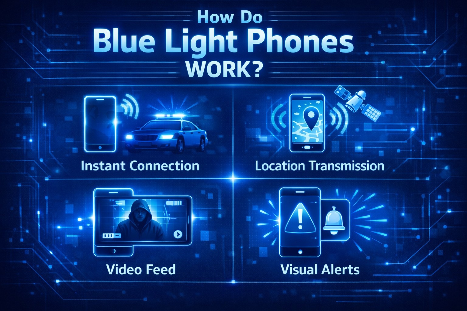 A blue light phone is an outdoor emergency call station that connects users directly to security or emergency services. It’s usually a tall pole with a glowing blue light on top and a single button that instantly alerts campus safety teams or local authorities when pressed.