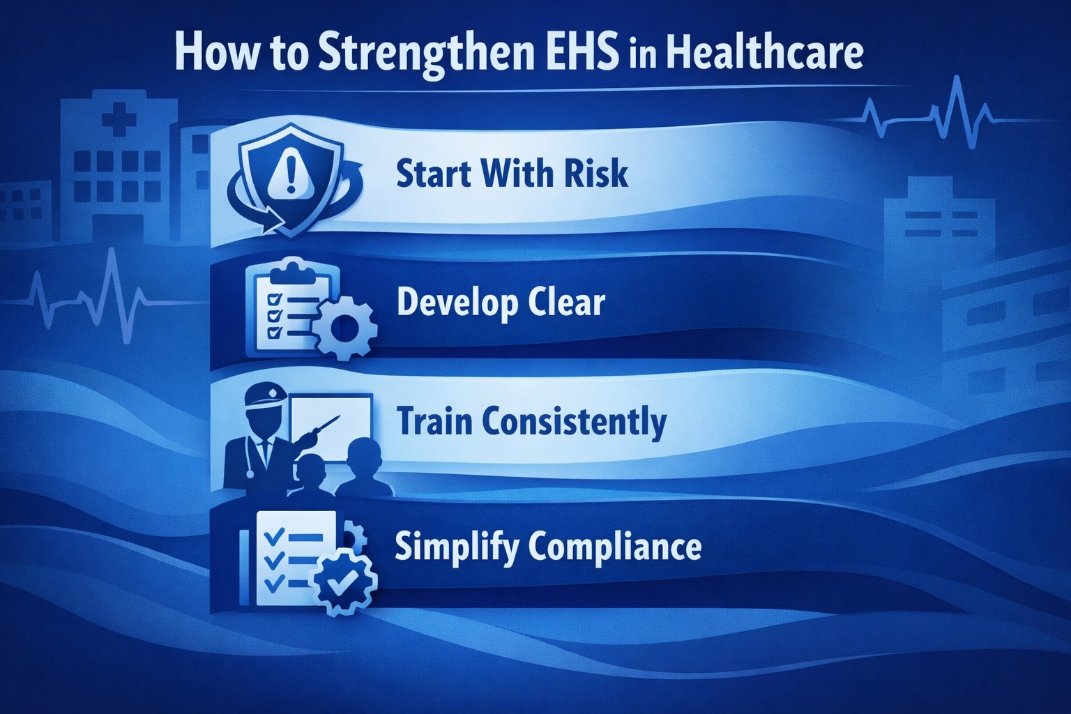 Building an effective EHS program takes strategy, commitment, and collaboration. It’s not something you can implement overnight; it grows with consistent effort and leadership support. Below are practical ways healthcare organizations can make EHS work in real life.